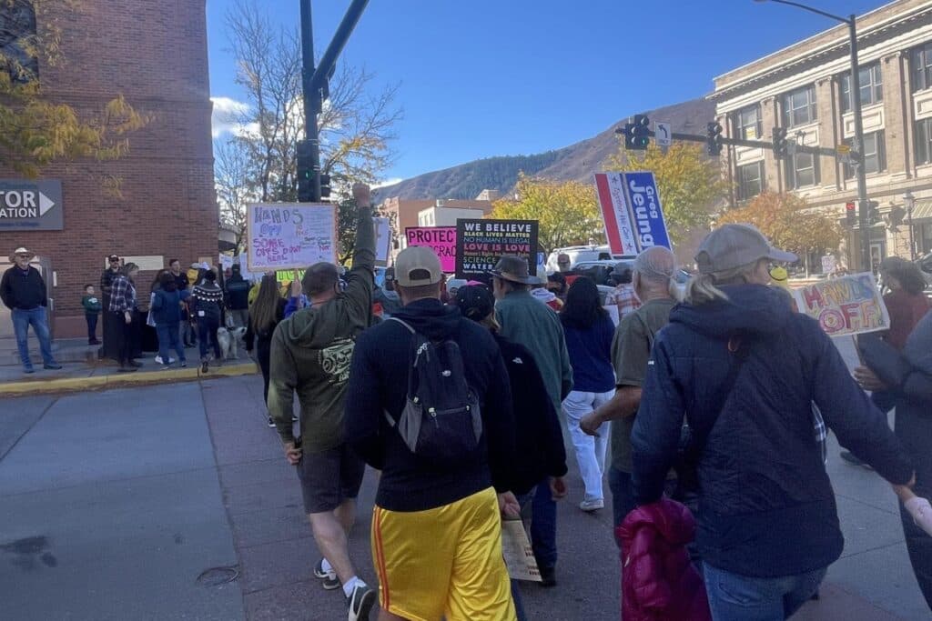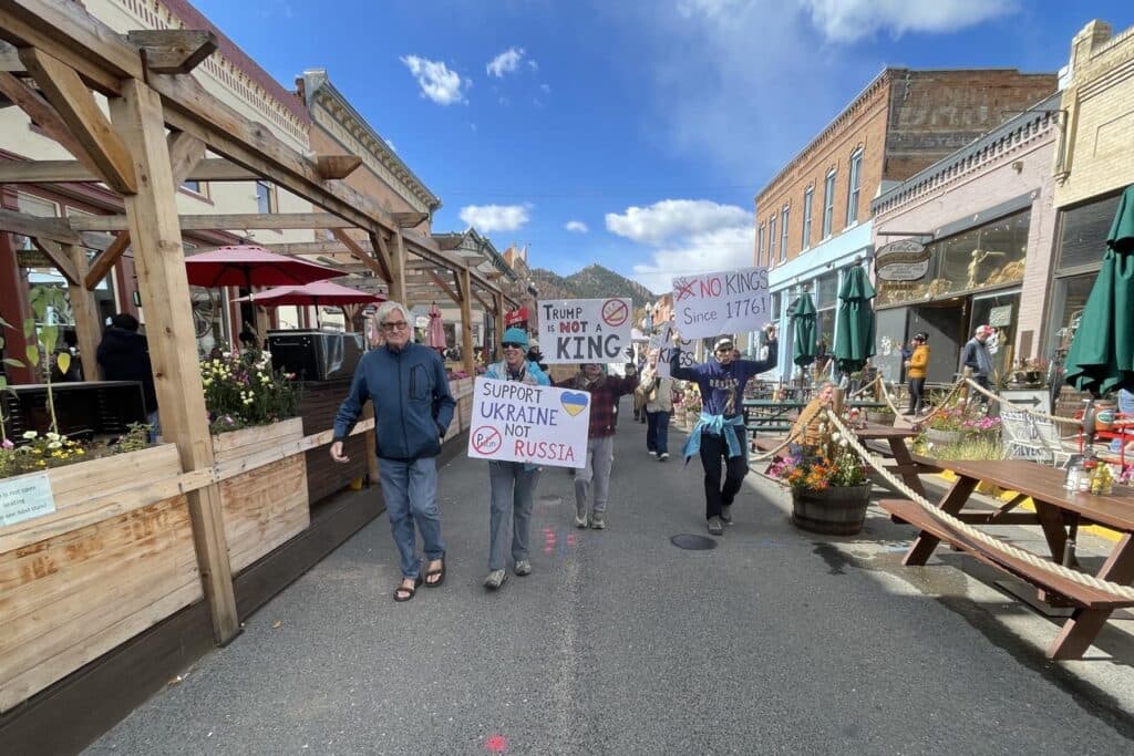 In the roughly 1,700-person mountain town of Idaho Springs, nearly 200 people rallied above the I-70 ramp and marched through the historic downtown, decrying the Trump administration and what they described as his “fascist” and “authoritarian” regime.