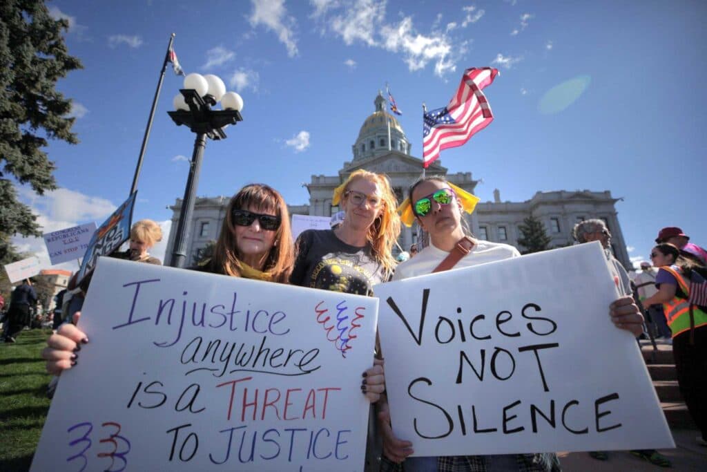 “The state of our country is just absolutely sad,” Amber Guerrero said as she waited for the Denver rally to begin. “I guess that’s really the best word. We’ve never been more divided. The administration is just ripping rights away from people.”