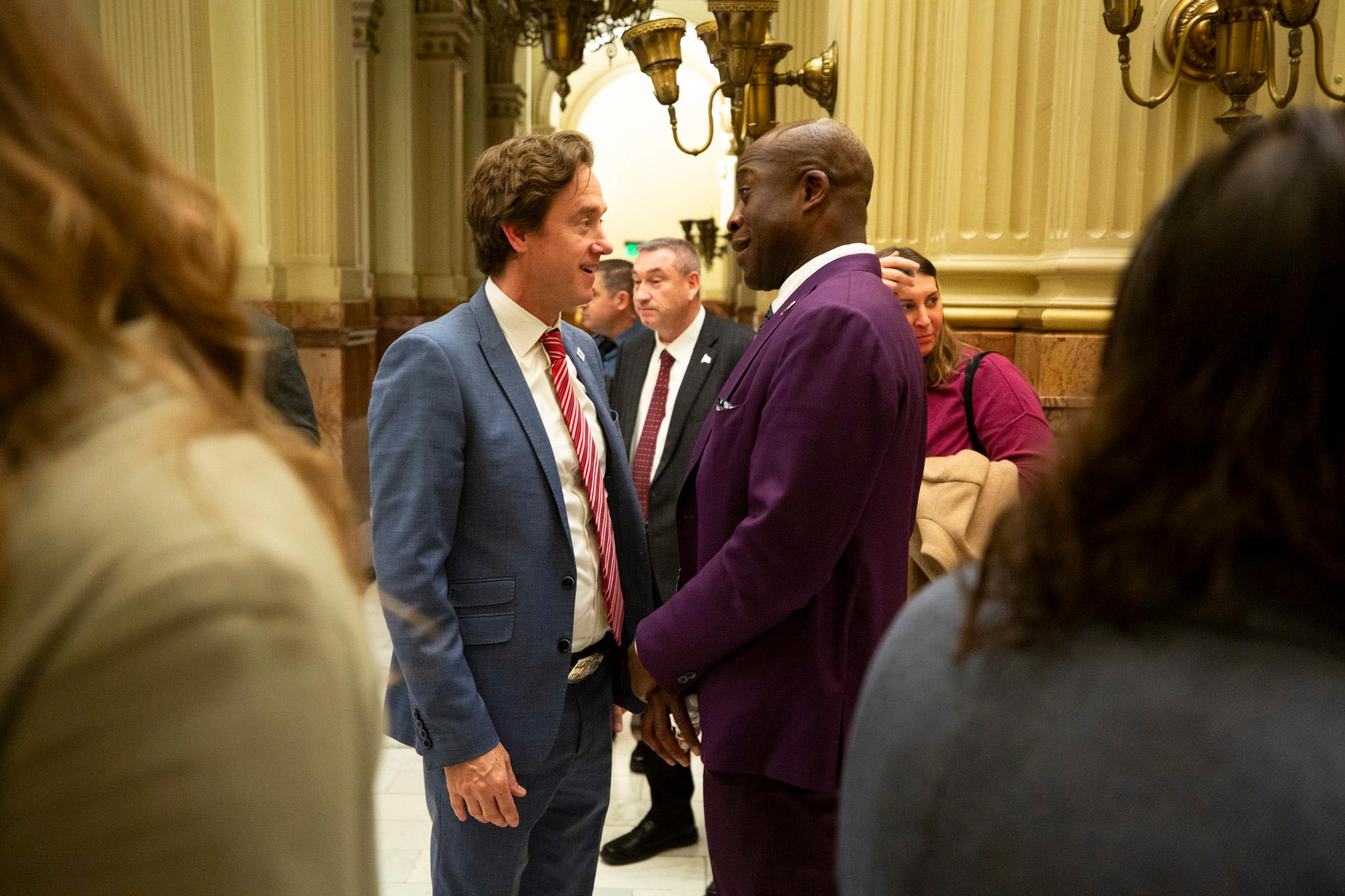 Denver Mayor Mike Johnston (left) and Colorado Springs Mayor Yemi Mobolade chat before Gov. Jared Polis gives his final State of the State Address at the State Capitol. Jan. 15, 2026.