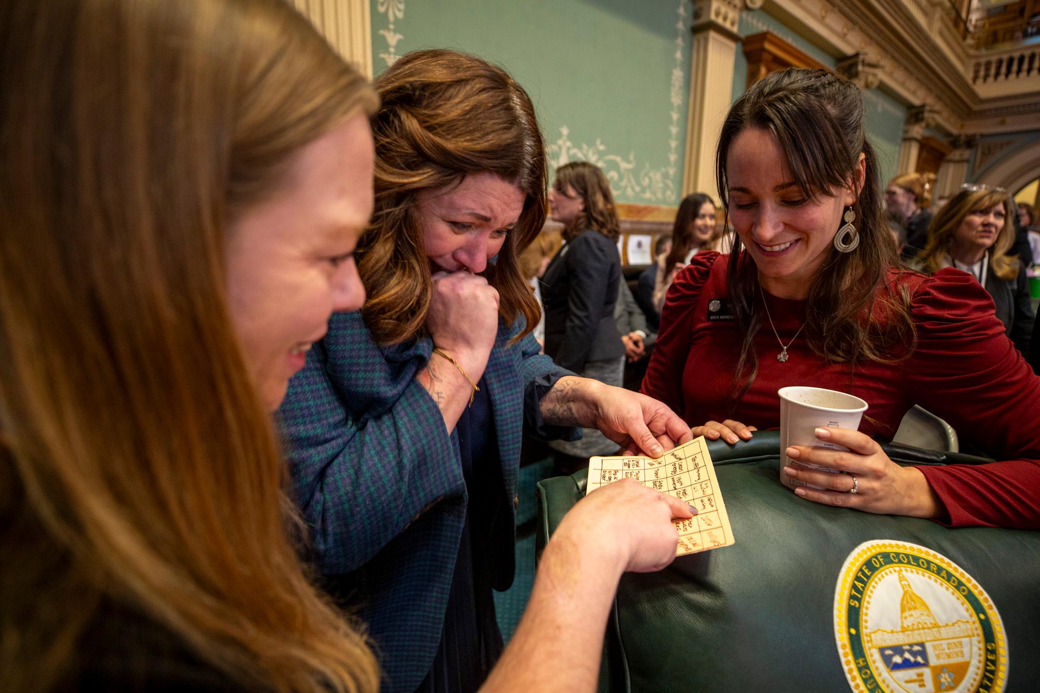 Colorado State Sen. Katie Wallace (from left), Rep. Jenny Willford and Rep. Lisa Feret make a bingo card ahead of Gov. Jared Polis' final State of the State Address. Jan. 15, 2026.
