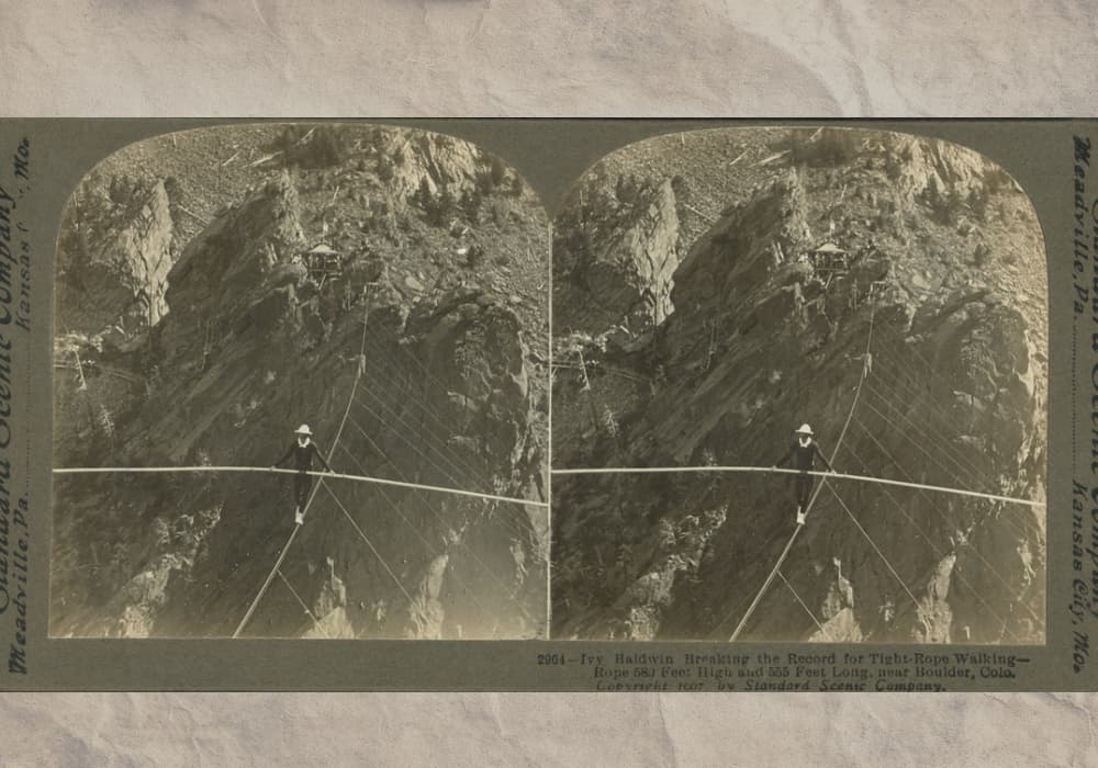 He was also a tightrope walker who balanced his way high above the roaring waters of South Boulder Creek dozens of times. Clad in white, with a 26-foot pole for balance, Baldwin crossed the creek on a wire suspended nearly 600 feet high. It was perilous. Once, a strong gust of wind forced him to hang from his knees for more than an hour. And there were other close calls.